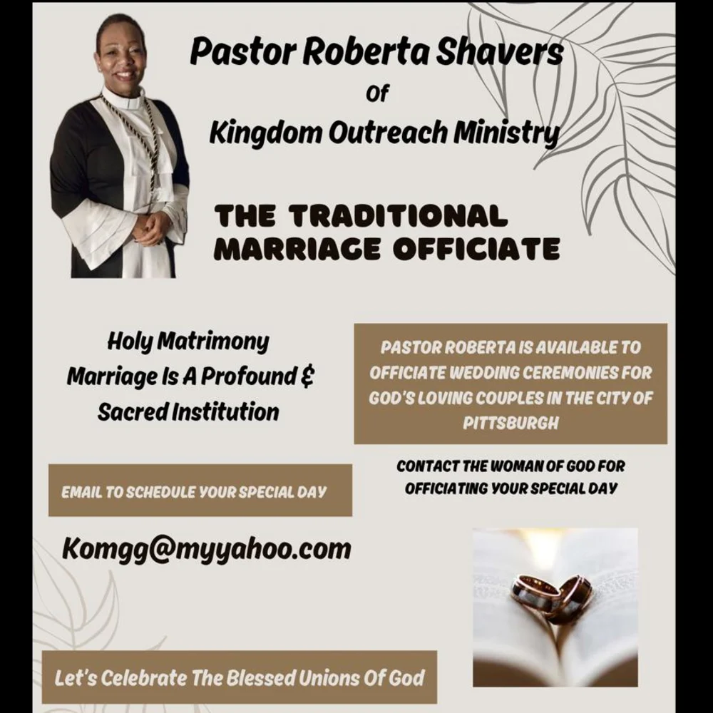 I am Pastor Roberta Shavers. I am the pastor of Kingdom Outreach Ministry. Our ministry promotes and support families. We also support children's programs and veterans, for I have served in the United States Army myself.